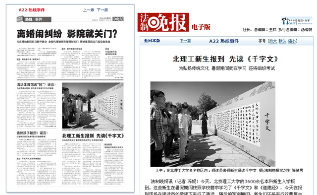 據北京理工大學黨委副書記、副校長李和章介紹,為大力弘揚傳統文化,學校在今年的暑假期間為新生們布置了“暑假作業”:在家自學《千字文》和《道德經》。李校長說,當今社會主義核心價值觀的12個詞都是從中華傳統文化中提取出來的精髓,所以傳統文化的學習對于學生的道德水平提高也有一定的促進作用。