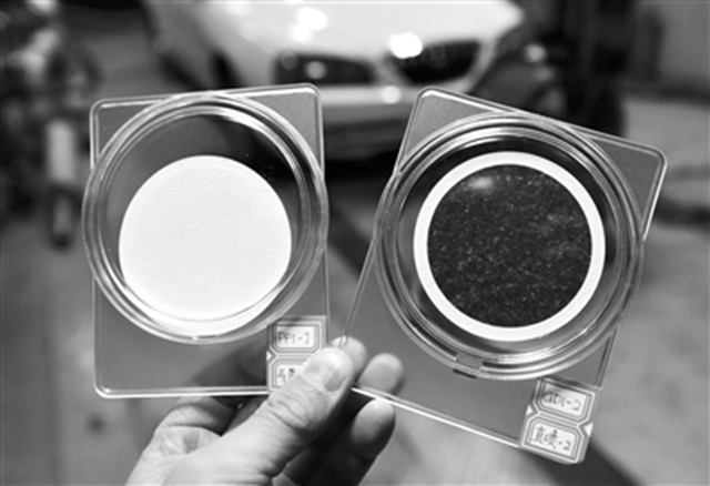 污染程度直觀反映在濾紙上,右邊變黑的濾紙的PM濃度接近5000微克/立方米