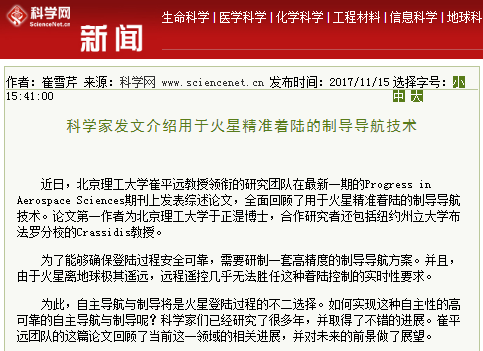 【科學(xué)網(wǎng)】北理工科研團隊發(fā)文介紹用于火星精準著陸的制導(dǎo)導(dǎo)航技術(shù)