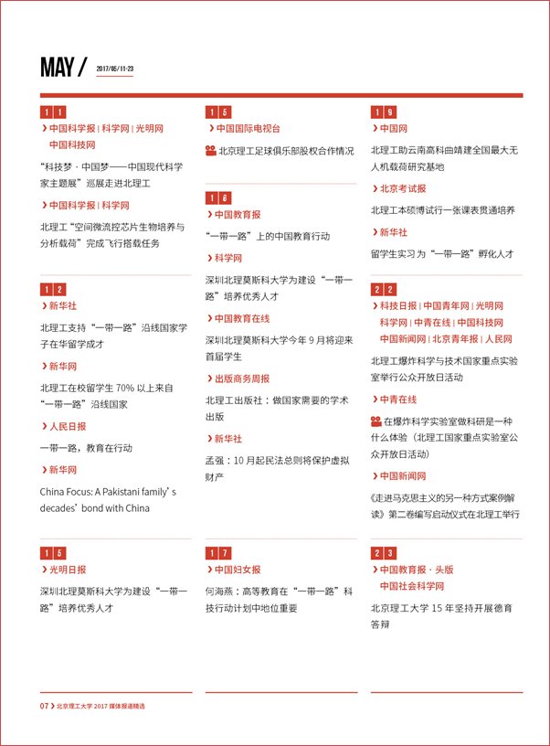 2017年,黨委宣傳部主動策劃學校重大活動外宣48次,共收集媒體首發報道678次,比去年同比增長約77%。新華社、《人民日報》《光明日報》《北京日報》《中國科學報》《科技日報》等媒體,通過平媒、網媒、新媒體以及手機客戶端發布我校報道600余次,中央電視臺、北京電視臺、中國教育電視臺等電視媒體報道50余次,積極打造對外宣傳的“全媒體”格局。