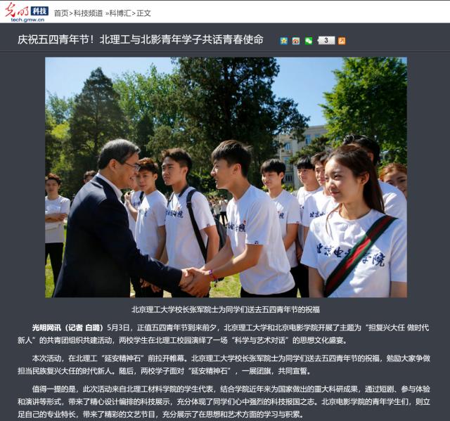 編輯:辛嘉洋 審核:王征 閱讀次數:【編者按】5月3日,在五四青年節前夕,北京理工大學和北京電影學院開展共青團組織共建活動,兩所學校百余名團員青年共同學習習近平總書記在北京大學師生座談會上的講話精神,開展“擔復興大任 做時代新人”主題團日活動,在美麗的北理工校園演繹了一場“科學與藝術對話”的思想文化盛宴。這是繼今年3月北理工校長張軍院士引用北影學生王俊凱演唱的《明日歌》勉勵畢業生,在引發校內外關注后,北理工抓住契機策劃開展的延伸教育活動。在本次活動中,兩校青年學生代表共同學習宣傳習近平新時代中國特色社會主義思想和黨的十九大精神,牢記5月2日習近平總書記在北京大學考察時對新時代廣大青年成長發展的期望與要求,共話青春夢想,充分展現了新時代優秀團員青年勇擔民族復興大任,努力成長為社會主義建設者和接班人,不辱時代使命,不負人民期望,爭做時代新人的青春風采,再次引發各界廣泛關注,《北京日報》《光明日報》《中國科學報》《中國青年報》《中國日報》《北京青年報》、團中央新聞中心、光明網、騰訊網、新浪網等各大媒體第一時間進行了報道。