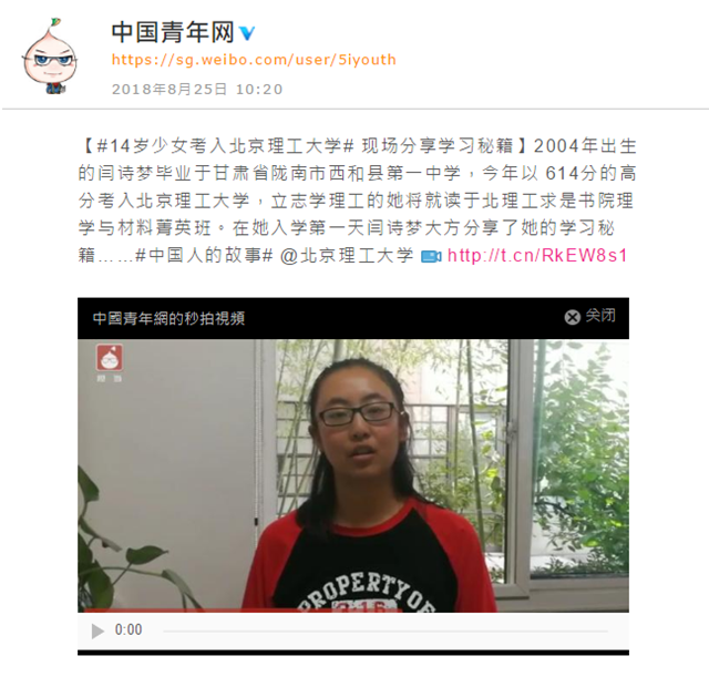 【中國青年網-微博】14歲少女考入北京理工大學 現場分享學習秘籍