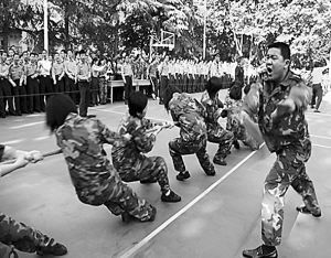 “一玉口中國,一瓦頂成家,都說國很大,其實一個家。”來自北京理工大學信息對抗專業的08級國防生趙俊以《我為祖國喝彩》為題,號召全體國防生牢記5月2日胡錦濤總書記同中國農業大學師生共迎五四青年節時的教導:把愛國主義作為始終高揚的光輝旗幟,把勤奮學習作為人生進步的重要階梯,把深入實踐作為成長成才的必由之路,把奉獻社會作為不懈追求的優良品德……