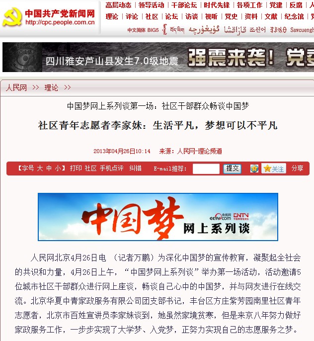 為深化中國夢的宣傳教育,凝聚起全社會的共識和力量,4月26日上午,“中國夢網上系列談”舉辦第一場活動,活動邀請5位城市社區干部群眾進行網上座談,暢談自己心中的中國夢,并與網友進行在線交流。北京華夏中青家政服務有限公司團支部書記,豐臺區方莊紫芳園南里社區青年志愿者,北京市百姓宣講員李家妹談到,她雖然家境貧寒,但是來京八年努力做好家政服務工作,一步步實現了大學夢、入黨夢,正努力實現自己的志愿服務之夢。