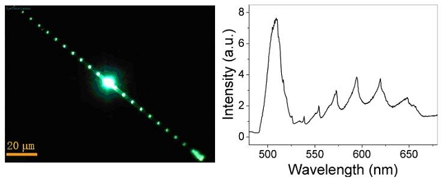 在這個工作中,該團隊的代國章博士后采用一種簡單可控的微區CVD方法實現了一維的光子超晶格結構,主要是II-VI族CdS/CdS:SnS2微米線的生長。這種微米線受光激發后能夠產生非常完美的周期性發光,且發光的周期可以通過改變超晶格分段的長度實現調控,光子限域的特征十分完美。其簡單的合成方法與材料在光(子)學響應的的結果在國際上首次報道。該成果對降低微型固態激光器的激發閾值、實現新型光波導、光開關,研究激子與光的相互作用具有重要的意義。