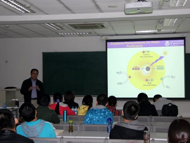 鑒于趙修松教授在納米領(lǐng)域作出的突出性成績,材料學(xué)院于10月23日下午16:10-18:00在研究樓405邀請趙修松教授給材料學(xué)院及相關(guān)研究領(lǐng)域的其他院系研究生上了一次“納米材料與物理”課,主要介紹了石墨烯的發(fā)展歷史、制備及應(yīng)用,以及趙教授課題組近五年來在石墨烯制備及應(yīng)用領(lǐng)域取得的一些創(chuàng)新性成果。趙教授進行了細致的講解,同學(xué)提問了很多關(guān)于納米科技前沿的問題,互動熱烈,學(xué)生反響很大,尤其是本校的國際研究生更是希望以后多搞此類外國專家的英文授課。