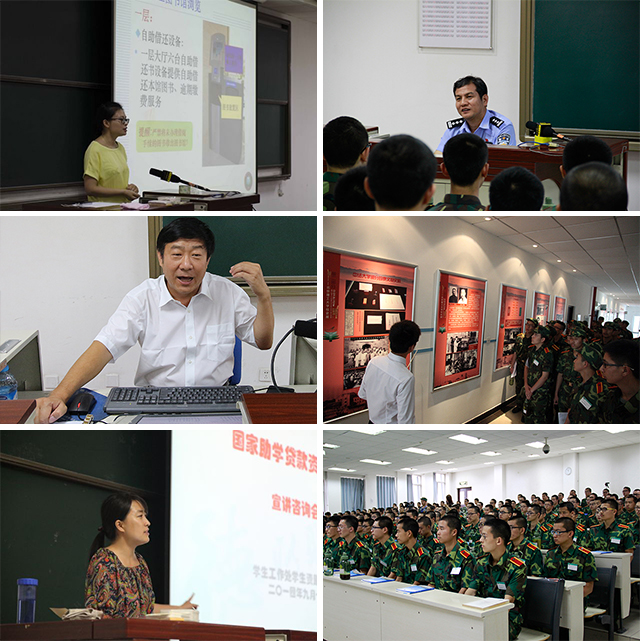 根據學校2014年新生入學教育相關工作的整體安排,在軍事理論培訓期間,軍訓旅組織學員參加各項新生入學教育活動:圖書館資源使用培訓、校紀校規教育和交通安全培訓旨在幫助學員盡快熟悉校園環境,完成高中向大學的轉變,為大學四年的學習和生活打牢根基;校史專題講座、校史長廊參觀活動旨在引導學員了解北理工光榮歷史,增強學員對學校的認同感,提升學員愛校榮校的主人翁意識;資助政策宣講會為學員全面介紹我校學生資助政策體系,為學員融入校園、安心學習提供良好基礎和便利條件;傳統文化教育意在引導學員繼承和弘揚中華民族優良傳統,成長為有素養、有內涵的,優秀的北理工人。